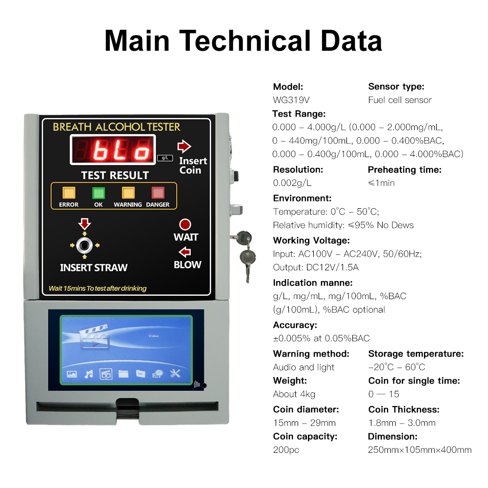 AT319V Coin-Operated Alcohol Breathalyzer – Professional Fuel Cell Breath Alcohol Tester with Digital LCD Display